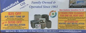 Up to $200.00 off an air conditioning installation- Mansfield Oil & Energy Installation only.